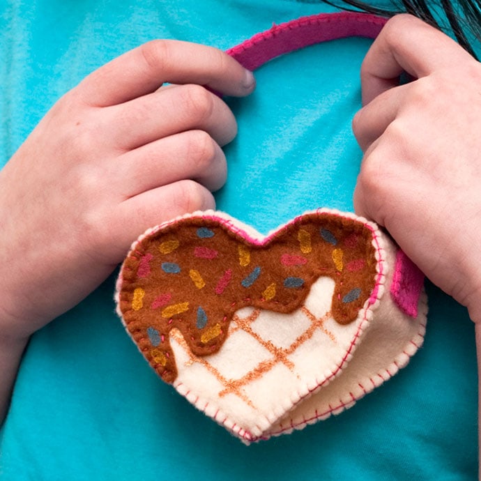 This sweet purse is shaped like a big puffy heart with a simple flap. Kids love choosing felt colors and stitching or gluing the edges, and it looks cute for pretend play or tiny treasures.