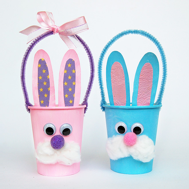 - Punch two holes opposite each other on one cup; knot ribbon ends inside for a handle.