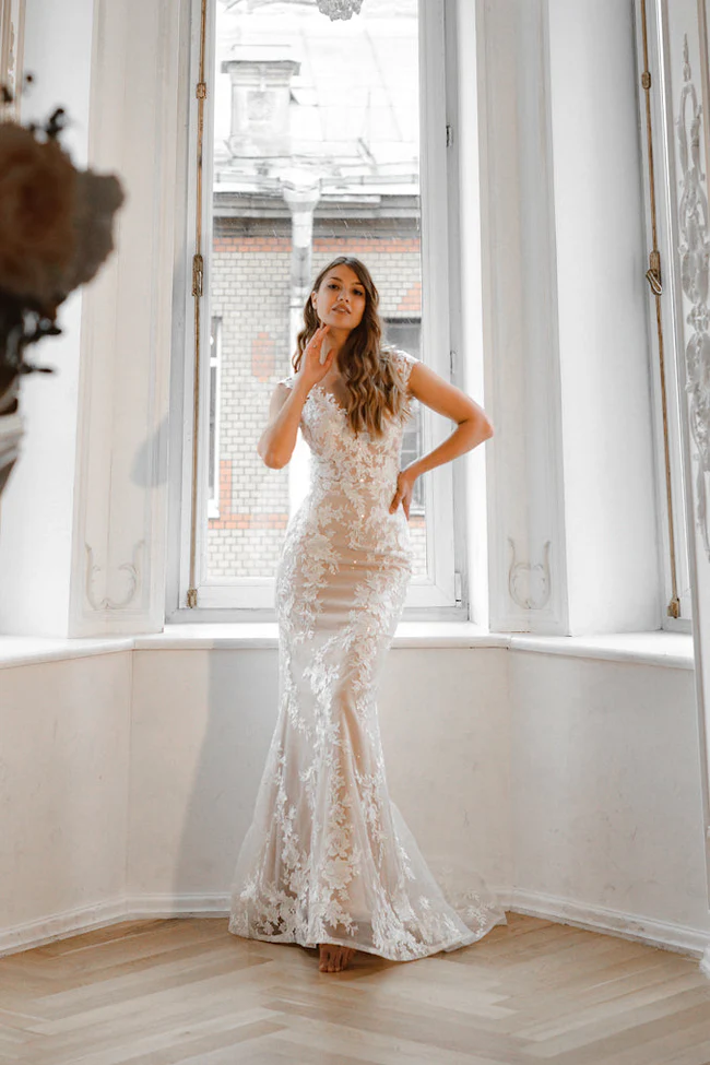 I love how mermaid dresses fit tight through the body and flare out at the knees. The floral details add fairy magic to this classic shape.