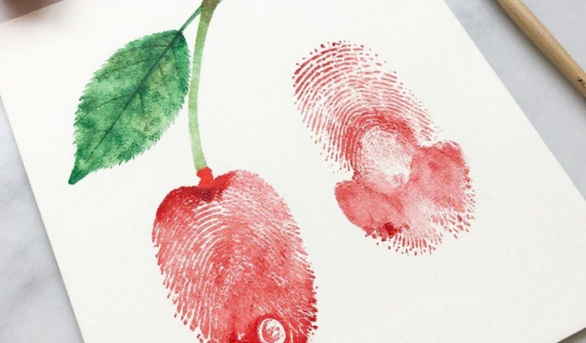 This is a cute picture of two bright red cherry fingerprints connected by a green stem and a leaf. Kids love pressing their fingers in paint and seeing fruit appear with just a few touches.