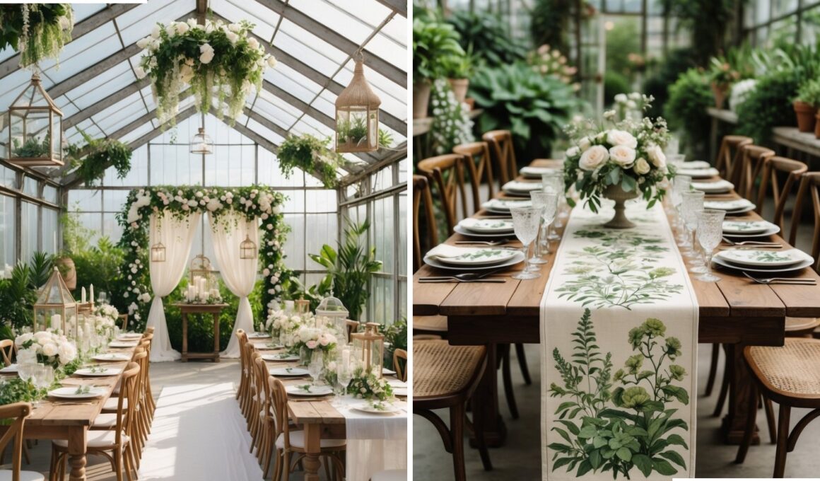 I like using vintage botanical print table runners for greenhouse weddings. They add a classic touch that fits well with the natural setting.