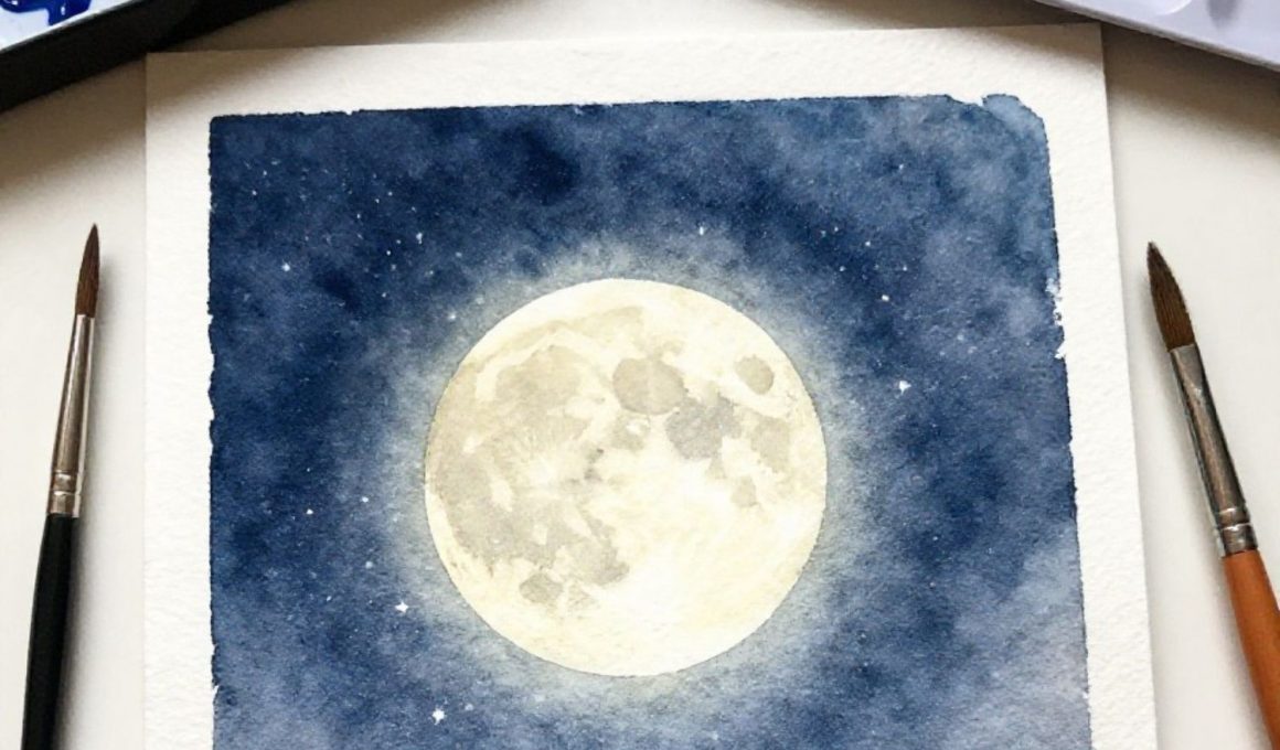 A pale full moon glows on watercolor paper, surrounded by gentle blue-gray washes that fade like a quiet night sky. This one is soothing because you let the water do some of the work, and beginners can practice blending without needing perfect lines.