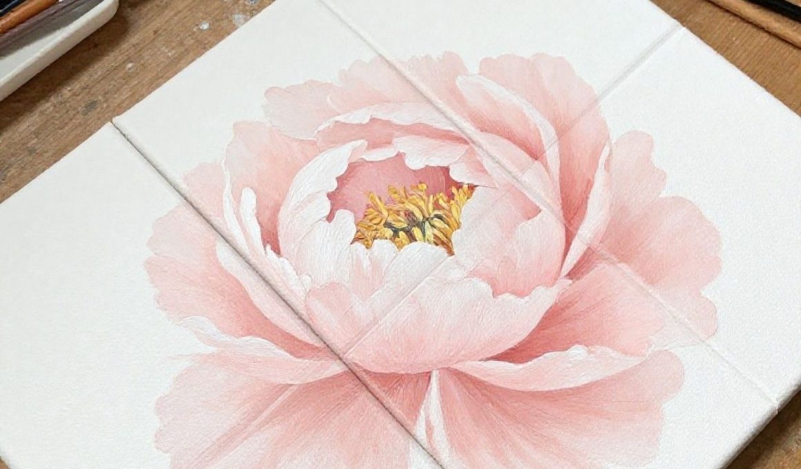 A set of tiny canvases each shows one simple peony bloom in a different soft color, like blush, cream, and peach. These are fun because they’re quick wins, and they’re perfect for beginners who want to practice petals without the pressure of a big painting.